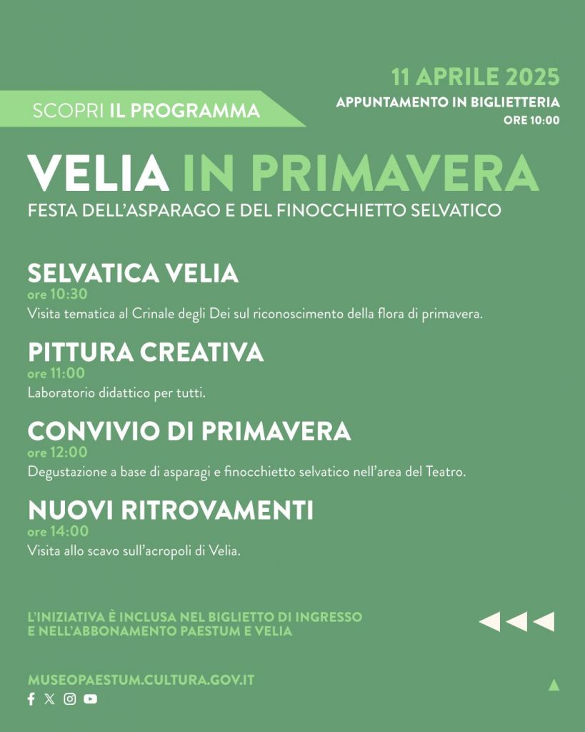 Alle 10:30, prenderà il via la visita tematica “Selvatica Velia“, che condurrà i partecipanti lungo il suggestivo Crinale degli Dei. In questo percorso, si imparerà a riconoscere la flora primaverile che caratterizza il parco, con un focus speciale sull’asparago e sul finocchietto selvatico, due piante tipiche della stagione e del territorio.