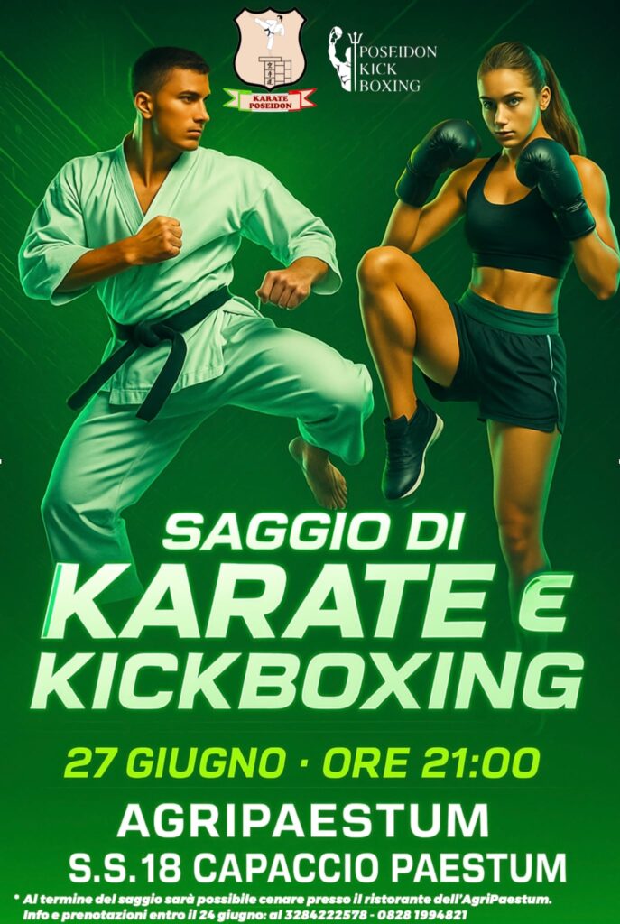 Il Dojo Poseidon di Capaccio Paestum, sotto la guida esperta del Maestro Ferdinando Polito, è lieto di invitare la cittadinanza al Saggio di Fine Anno Sportivo di Karate e Kickboxing, che si terrà presso l’AgriPaestum (S.S.18) alle ore 21:00.