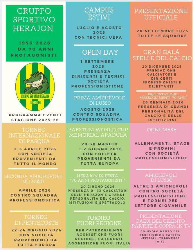 Nella ricorrenza del 70° Anniversario dalla Fondazione, il G. S. Herajon 1956 sta organizzando un nuovo Progetto che vede protagonista non solo lo Sport ma anche il Territorio. Valorizzare la nostra Terra, i Prodotti Tipici e le Attività Produttive praticando lo Sport è il nostro nuovo Traguardo. Sentiamo forte la responsabilità di essere la Prima Società Fondata a Capaccio Paestum , per questo vogliamo alzare l’ asticella, una Città con 23.000 abitanti non può non avere una Prima Squadra nell’ Elite del Calcio Dilettanti e non può non essere il Punto di Riferimento per i Futuri Talenti del Calcio del Cilento. In tanti si sono spacciati e si spacciano per riferimenti del Territorio, ma il Grande Problema è che non hanno capito che non si fa tutto solo con i soldi, ci vuole Professionalità, Capacità e Programmazione per diventare una Fucina di Futuri Campioni e creare un Progetto valido di Squadra che calchi per anni i campi dell’ Elite del Calcio Dilettanti e ambisca ad entrare nel Calcio Professionistico. Basta con gli Incapaci, con i Chiacchieroni e soprattutto Basta con i Personalismi. Il Sistema Fiscale Italiano e le Leggi non permettono più di fare il Calcio con i Soldi, c’è bisogno di Creare Esempi per il Mondo del Dilettantismo che sta morendo giorno dopo giorno. Noi abbiamo una nostra linea e vogliamo portarla avanti, stiamo programmando il Futuro a partire dal Campo Sportivo Apadula di Gromola, anche il Mario Vecchio bisogna mettere a nuovo. Nel momento in cui le due strutture saranno pronte il Gruppo Sportivo Herajon è pronto per la Serie D, nel frattempo stiamo preparando giovani del nostro Settore Giovanile per questo grande Evento, saremmo pronti a un Grande Progetto coinvolgendo altre realtà ma abbiamo capito che la programmazione non piace, a noi si e quest’anno prepariamo squadre competitive per Campionati Provinciali e Regionali, bisogna tornare a Vincere e a Essere Competitivi dalla Prima Squadra al Settore Giovanile. Sarà un anno importante, un anno dove Capaccio Paestum sarà protagonista con il Gruppo Sportivo Herajon in TV, su Piattaforma Sky e Digitale Terrestre, coinvolgeremo tutto il Territorio e le Attività Produttive, tante saranno le Amichevoli con Società Professionistiche e tanti saranno i Tornei che parteciperemo, in Italia e all’ Estero.Ai nostri due Tornei Internazionali porteremo le Società di Serie A e B, si le porteremo qua’ per fargli apprezzare i prodotti del nostro Settore Giovanile come faceva il Grande Salvatore Apadula. Basta Improvvisazione, presto incontreremo il Sindaco, che deve ascoltarci e stare al nostro fianco, perché noi Lavoriamo per il Futuro della nostra Città e dei nostri Giovani, anzi dei nostri Futuri Campioni. Forza Herajon. Il Presidente Gaetano Tolomeo