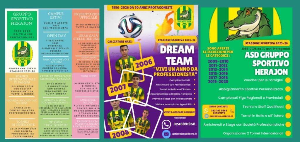 Stagione Sportiva 2025-26, il G. S. Herajon 1956, ricorrerà il 70° Anniversario dalla Fondazione, vogliamo fare le cose in Grande, Grandi Eventi e Grandi Programmi, vogliamo alzare l’asticella e programmare un grande Futuro per la Città e tutto il Territorio, preparare la Grande ascesa di Capaccio Paestum nell’ Elite del Calcio Dilettanti. Da anni parlo di 2026 come anno in cui la nostra Città deve raggiungere l’ Apice del Calcio Dilettanti, ecco quest’ anno faremo un’ altro passo per prepararci al Grande Evento. Ora le Istituzioni e gli Imprenditori ci seguano. Un Grande Settore Giovanile per una Grande Prima Squadra che, oltre a creare i Futuri Calciatori Professionisti, deve dare un Grande Slancio a tutto il Territorio, sotto ogni aspetto.