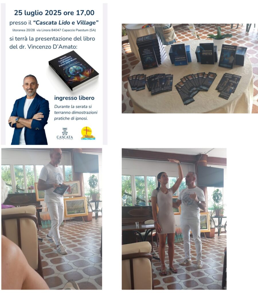 Ieri pomeriggio, venerdì 25 luglio nella splendida location del lido Cascata in Capaccio Paestum, Vincenzo D’Amato dottore in Scienze e tecniche psicologiche, Ipnologo-Formatore-Scrittore Ceo & Founder “CD Academy” ha presentato il suo ultimo libro, presenti molte persone che hanno mostrato tanto interesse all’argomento, il Dottor D’Amato nello spiegare l’argomento, ha anche dato qualche piccola dimostrazione di pratica ipnosi. Numerose le pubblicazioni del Dottor D’Amato, tutte interessanti e da leggere sicuramente.