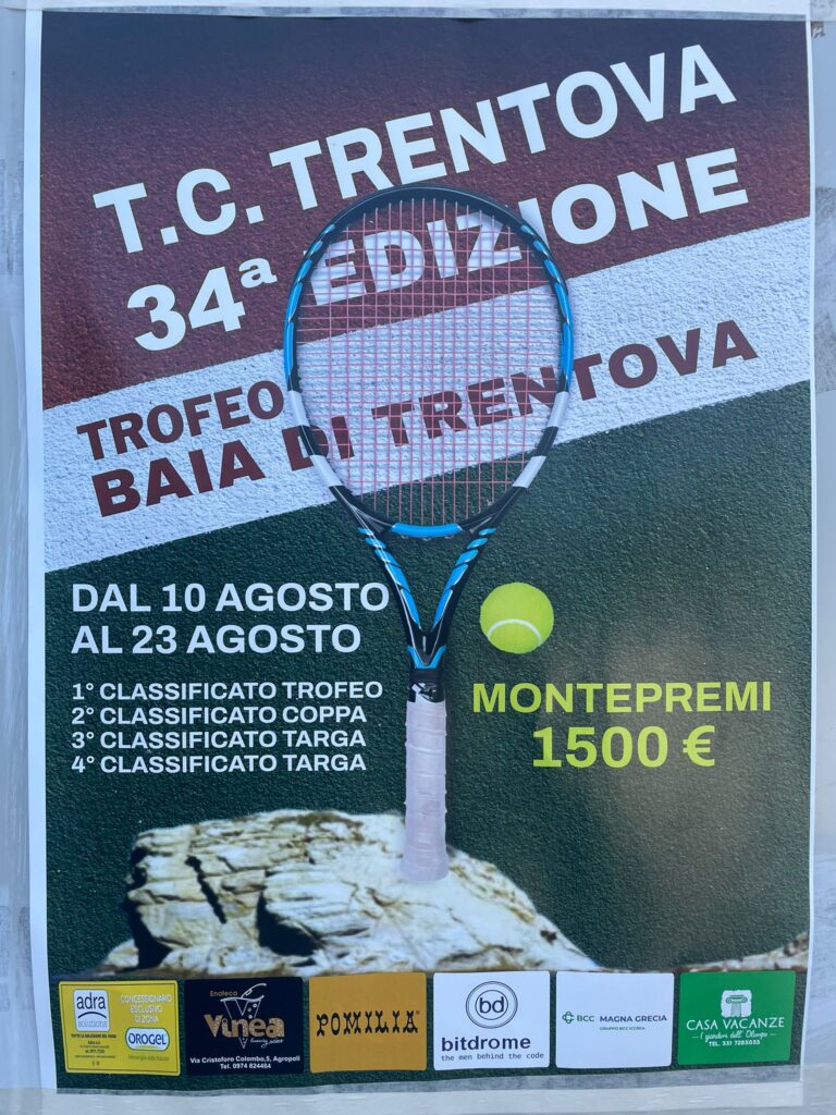 AGROPOLI – Si apre oggi, 10 agosto, la 34ª edizione del Trofeo Baia Trentova, appuntamento ormai storico del tennis estivo cilentano. Il torneo, di categoria open, mette in palio un montepremi complessivo di 1.500 euro e ha già registrato un’ottima partecipazione: ben 93 iscritti, di cui 64 appartenenti alla quarta categoria.