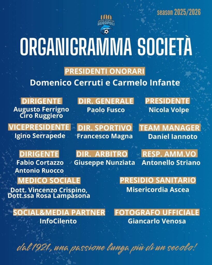 È con grande entusiasmo che annunciamo l’organigramma ufficiale per il campionato 2025/2026: una squadra di professionisti, uniti dalla stessa visione e da un solo obiettivo — riportare i colori biancazzurri dove meritano di stare.