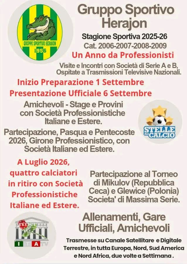 Il G. S. Herajon 1956, in occasione dei 70 anni di Attività, ha programmato, oltre a una Serie di Festeggiamenti che partiranno dal 1 Gennaio 2026 e si concluderanno il 31 Dicembre 2026; una Serie di Attività volte a dare grandi opportunità a giovani Calciatori del nostro Territorio, di tutta Italia ed Europa.