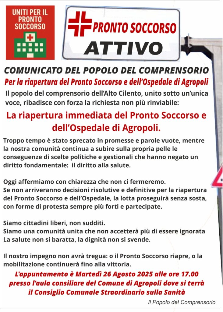 Riapertura del Pronto Soccorso e dell’Ospedale di Agropoli, la battaglia del popolo Alto Cilento e non solo continua, non si molla e le adesioni alla protesta sono sempre più numerose, il prossimo appuntamento per tutti è per il 26 agosto 2025 ore 17:00 come potete leggere sulla locandina in foto.