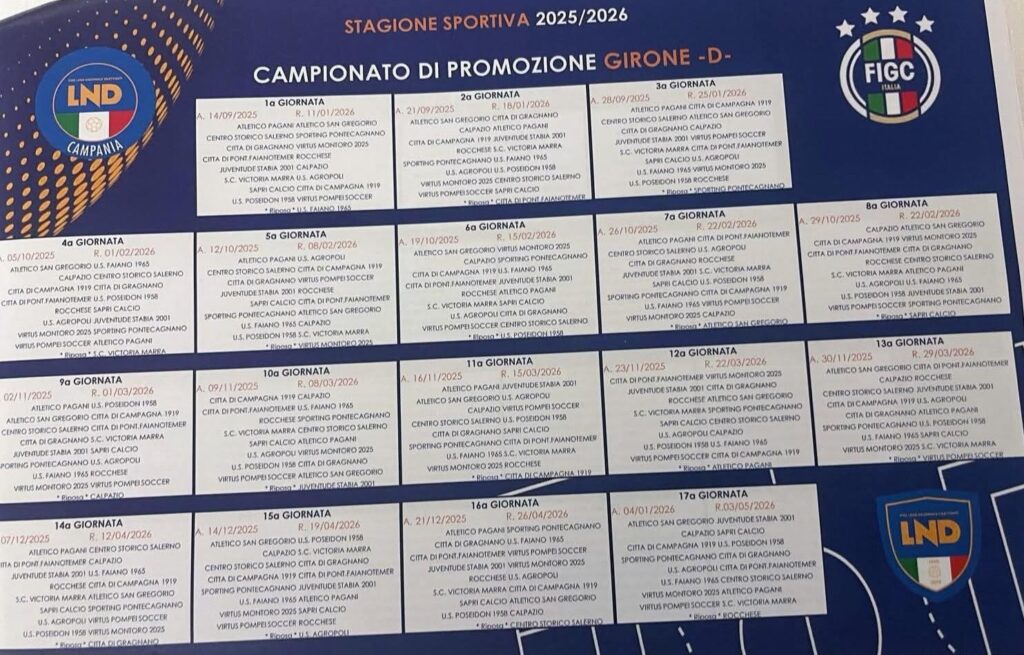 Campionato di calcio di Promozione, dove sono impegnate le nostre due squadre del comprensorio Comunale di Capaccio Paestum, si inizia il 14 settembre 2025, la Calpazio e la Poseidon, nella prima giornata la Calpazio di mister Gaetano Pecora va fuori casa ad incontrare la Juventude Stabia, mentre la Poseidon di mister Gaetano gioca tra le mura amiche contro la Virtus Pompei, il derby di andata sarà il 21 dicembre 2025, Poseidon-Calpazio al “Mario Vecchio”. Buon Campionato e forza Calpazio e Poseidon sempre…