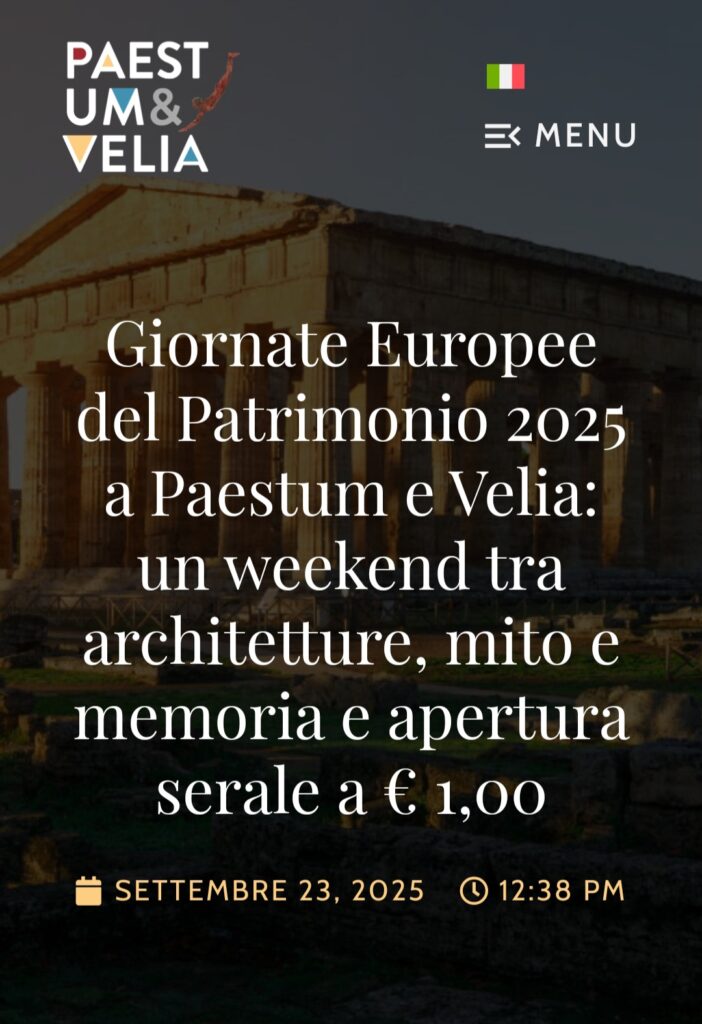 Scopri di più:https://parchipaestumvelia.cultura.gov.it/giornate-europee-del-patrimonio-2025-a-paestum-e-velia-un-weekend-tra-architetture-mito-e-memoria-e-apertura-serale-a-e-100/