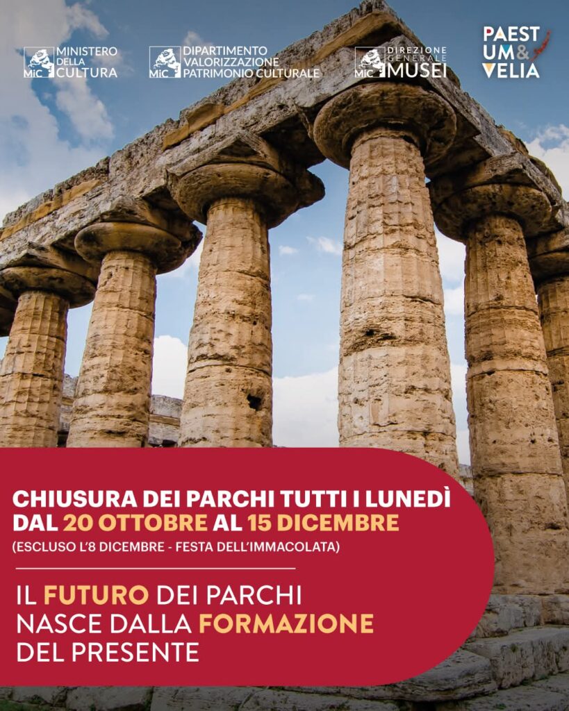 Maggiori informazioni: https://parchipaestumvelia.cultura.gov.it/chiusura-al-pubblico-dei-parchi-archeologici-di-paestum-e-velia-per-attivita-di-formazione-obbligatoria-del-personale-interno/