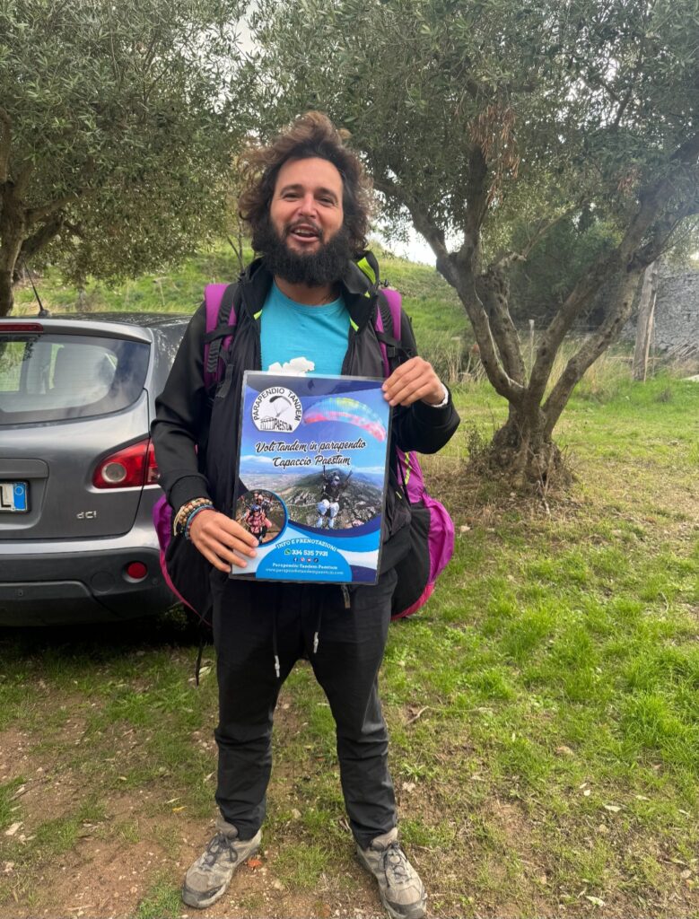 Ormai anche da noi a Capaccio Paestum è conosciutissimo, da alcuni giorni è ospite di nostri concittadini, lui è Adrian, lo Spagnolo giramondo che sta attraversando l’Italia a piedi con un solo obiettivo: DARE VISIBILITÀ ALLA SOLIDARIETÀ, ALLA GENTILEZZA UMANA E AL POTERE DELL’UNIONE IN UN MONDO CHE CI STA ABITUANDO A TANTE MALVAGITÀ E BRUTTEZZE! Ha voluto provare anche questa sensazione qui da noi, infatti ha volato in tandem su Parapendio insieme all’istruttore Carlo Raito, e si è detto contentissimo di questa esperienza in una location paradisiaca…A Capaccio Paestum siamo differenti in meglio logicamente…