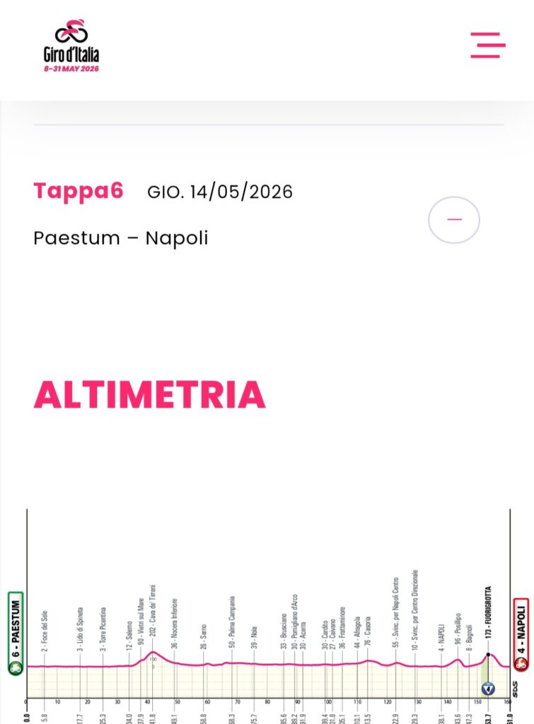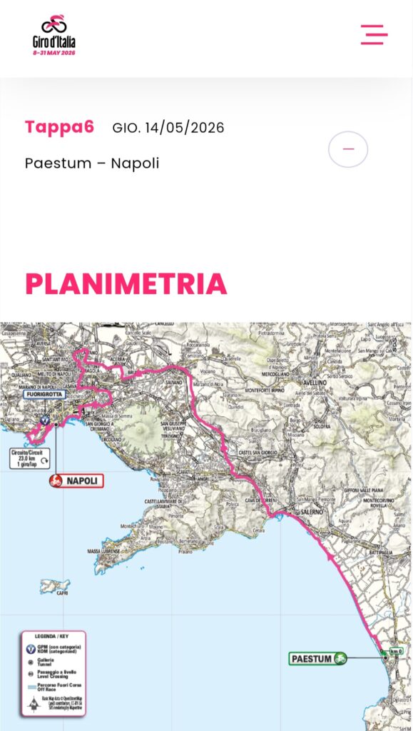 Adesso è ufficiale, giovedì 14 maggio 2026 la sesta tappa del Giro d’Italia di ciclismo per professionisti partirà dalla nostra Paestum per arrivare a Napoli dopo 161 km.