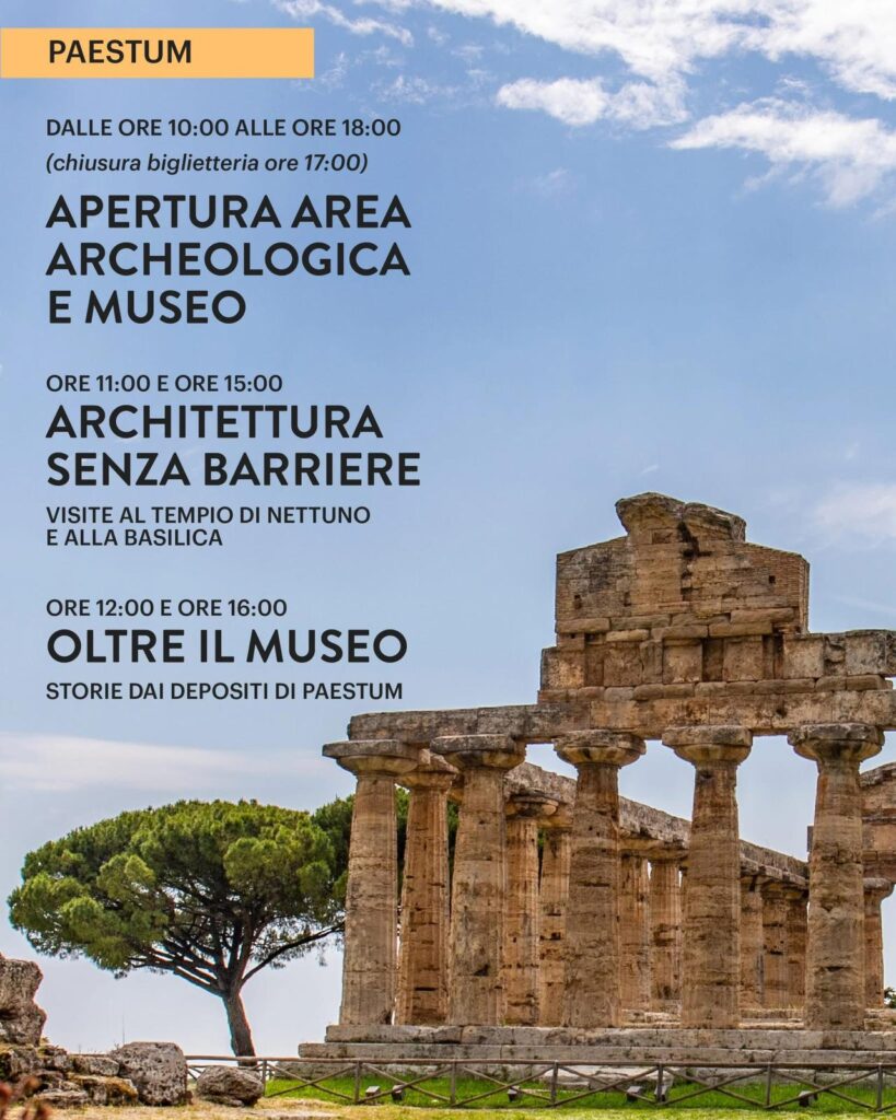 A Paestum, apertura del Museo e dell’area archeologica dalle ore 10:00 alle ore 18:00, con due appuntamenti speciali: alle ore 11:00 e alle ore 15:00 “Architettura senza barriere”, visite guidate al Tempio di Nettuno e alla Basilica, e alle ore 12:00 e alle ore 16:00 “Oltre il museo”, un viaggio tra le storie custodite nei depositi.