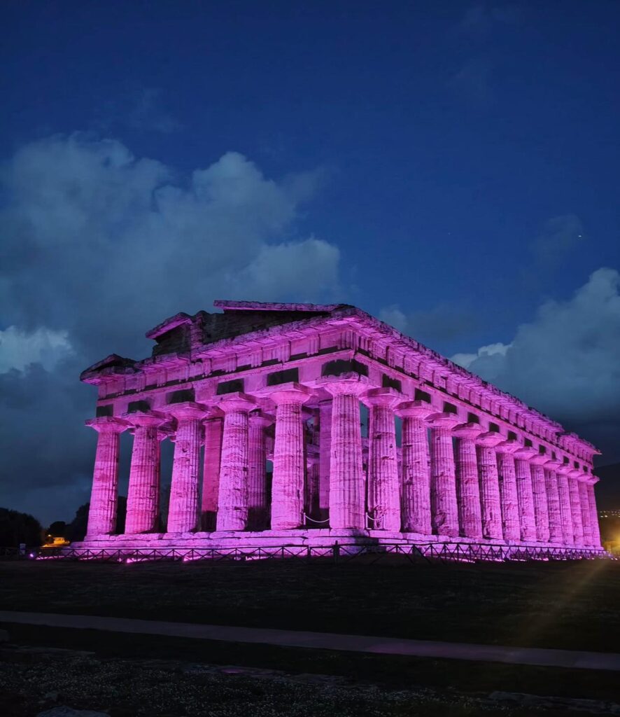 Stasera il Tempio di Nettuno è illuminato di rosa, anticipando l’arrivo della corsa e creando un incontro suggestivo tra l’energia dello sport e la solennità della storia, in un dialogo che attraversa secoli e passioni.