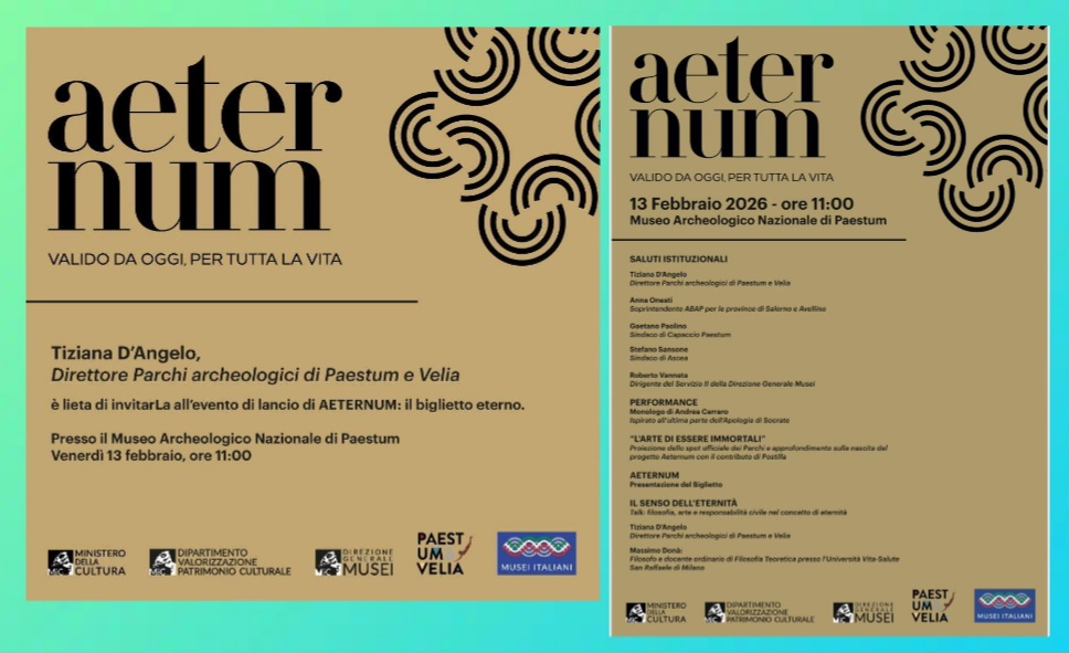 Il Direttore dei Parchi archeologici di Paestum e Velia, Tiziana D’Angelo, è lieto di invitarLa alla presentazione ufficiale di AETERNUM – Il Biglietto Eterno, la prima iniziativa in Italia di accesso a vita promossa da un’istituzione culturale statale.