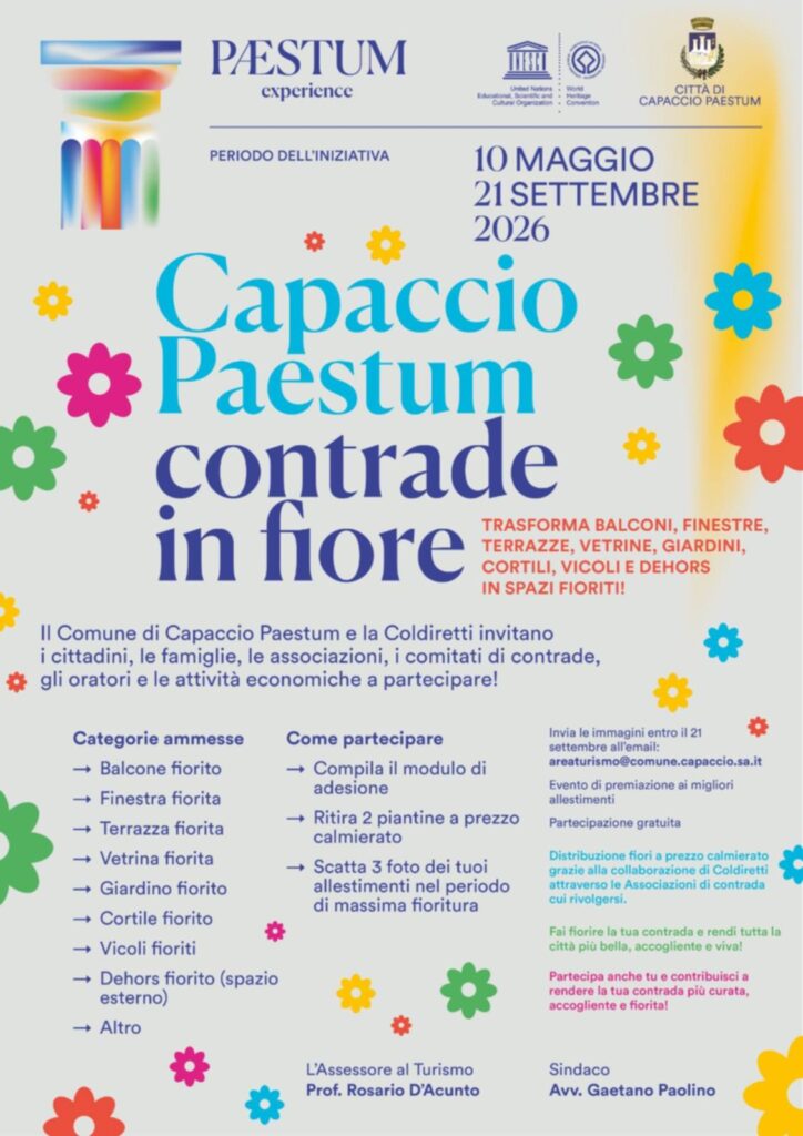 Bellissima iniziativa dell’associazione “PAIDIA” con il Progetto del Comune di Capaccio Paestum, con la Coldiretti, organizza “Contrade in fiore” lo scopo è che sarebbe bello passeggiare per il paese fiorito, dando un’immagine del nostro territorio di ulteriore positività. L’invito è esteso a tutti, sul manifesto che postiamo ci sono tutti i passaggi per partecipare, ovviamente più adesioni ci sono più avrà risalto questa nobile iniziativa.