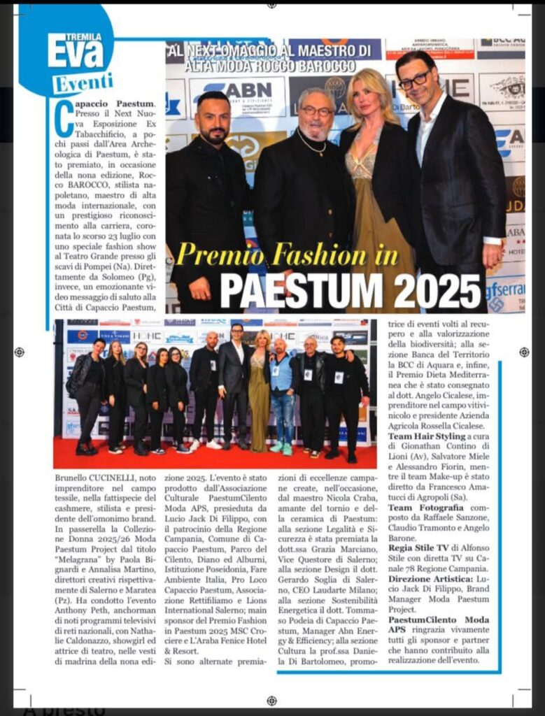 Nona edizione del Premio ‘Fashion in Paestum’ 2025, evento di moda, organizzato come sempre alla perfezione dal nostro concittadino Lucio Jack Di Filippo, e che in questa edizione 2025 all’ex Tabacchificio di Capaccio Paestum è stato premiato un Top mondiale della moda come lo stilista italiano Rocco Barocco, grande spazio sulla nota rivista di gossip e moda EvaTremila, Capaccio Paestum nella sua immagine positiva in giro per l’Italia e non solo, grazie Lucio Jack Di Filippo…Chapeau…
